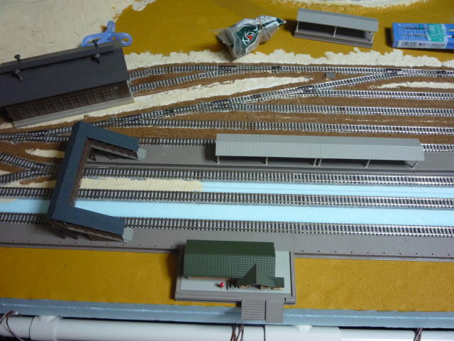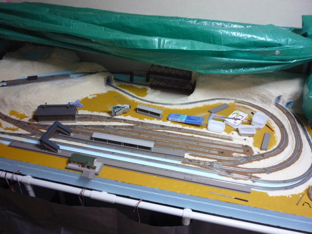 土日や早く帰宅できた日など、子供の目を盗んでコツコツと進めてます。 ストラクチャーの組立てや塗装等を行ってましたが、 やっと重い腰が上がりバラストの撒布が始まりました。 ![]() 内周・支線および車庫部分は非電化の古い路線ということで茶色のバラスト、 外周は電化新線なのでグレーのバラストを撒きます。 駅部分アップ。 ![]() 木造駅舎の階段がはみ出ている部分は切断して対応します。 ・・・本当はギリギリ収まる予定だったはずが、RailRoaderの精度が悪く収まらない事が判明していたorz まぁいいや。 |