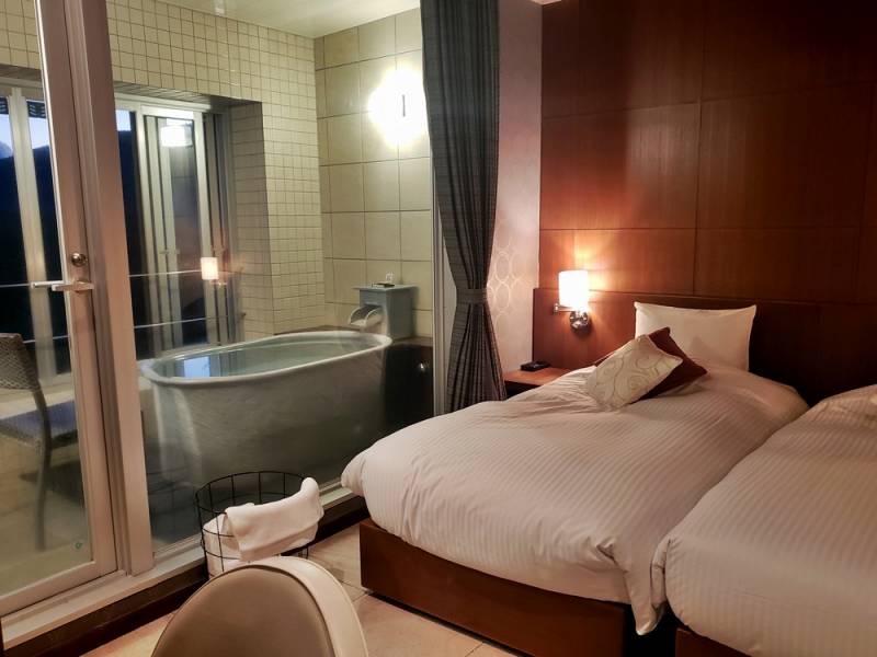部屋ごとに半露天風呂が備わっていて心行くまでまったりと